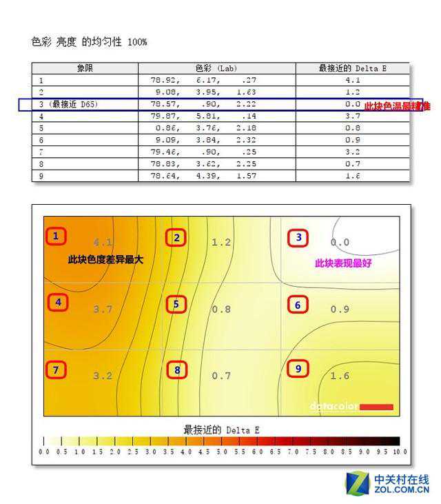 通过上图我们可以看到优派VP2775在色度均匀性方面的表现非常抢眼,在D65标准中,色温值为6500K表示色彩比较准确,不会出现偏冷或者偏暖。通过我们的测试,可以看到屏幕右上方的色温最接近D65的标准,而屏幕左上方的色温与标准色温值相差较大,差距最大为4.1,整体来说,优派VP2775的色度均匀性表现还是不错的。