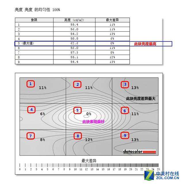 屏幕亮度均匀性的测试同样借助Spyder5Elite校色仪进行测试,将屏幕划分为9个大区域,分别测试计算屏幕在每个区域不同百分比的亮度以及色度坐标,最终得出以下的结论。(以下结果均在IRE输出达100%,即使用最大亮度和对比度输出时进行测试的结果)。