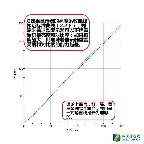 理论上而言,红、绿、蓝三条线完全重合,并且呈一对角直线是最为理想的。而优派VP2775的伽马曲线的测试结果还是不错的。这三条线从开始阶段到结束线条都接近直线而且接近。并且蓝色线成对角线的方向延伸。