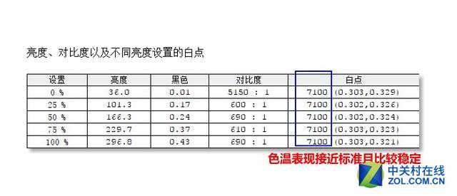 接下来,我们进行色温一致性的测试的目的在于考验显示器在不同亮度下白点色温的稳定性,用户可能会随时调节显示器的亮度,此时对比度和色温不应该发生太大的变化。我们分别将优派VP2775的亮度调节到0%、25%、50%、75%和100%,测试全白画面亮度和全黑画面亮度以及色度坐标,计算出对比度以及色温值,各个亮度下色温值和对比度比值不应发生太大变化。