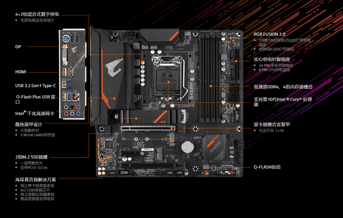 作为华硕的竞争对手技嘉,也有入门级游戏主板,Aorus小雕,技嘉B460对比B365升级不大,仅在主板涂装上配色不太一样,另外增加了一个固态的散热片还有CPU供电上部的MOS散热片,其他接口布局与B365保持了高度一致。