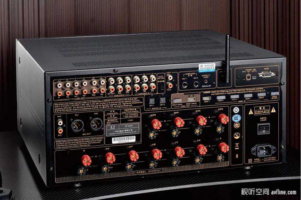 接口界面AT-2000配置了6个HDMI输入,2个HDMI输出(一个支持ARC),标准,支持协议,支持HDMICEC控制功能,确保各式蓝光机/机顶盒上的功能都能够联动;光纤/同轴输入各2个,外置蓝牙天线。AT-2000配备了一组12通道的RCA模拟输出,可以外接其他后级放大。而超低音则提供了2个XLR和2个RCA输出,方便连接各式各样的超低音。另外还配备了3组RCA输入可连接其他音源,以及一组5.1的RCA输入用作连接卡拉OK点播机。前后各2个6.3mm麦克风接口,可以多人同唱。红外、12VTrigger、RS232等操作接口也齐备,方便接入影院主控。在AT-2000前方有一个USB接口,后方则有一个TF卡插槽,可以读取用户存放在其中的音乐文件。