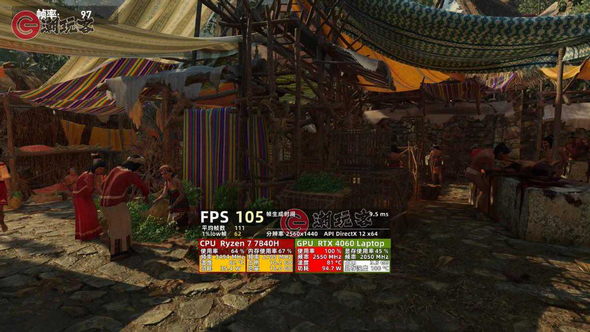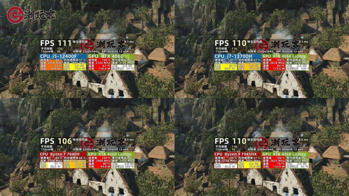 下一个游戏是古墓丽影:暗影,这个游戏和彩六一样,显卡必吃满,同时对CPU性能要求较高,1080p下平均帧依然是和性能相关,最低帧则是CPU功耗发挥稳定的两位选手胜出,2K分辨率下由于显卡压力过大,几位选手的平均帧基本没多少区别了,但7840H在这个游戏里依然是被按在地上摩擦,同时偶尔有个13700H和它陪跑,13700H的功耗真不算小。