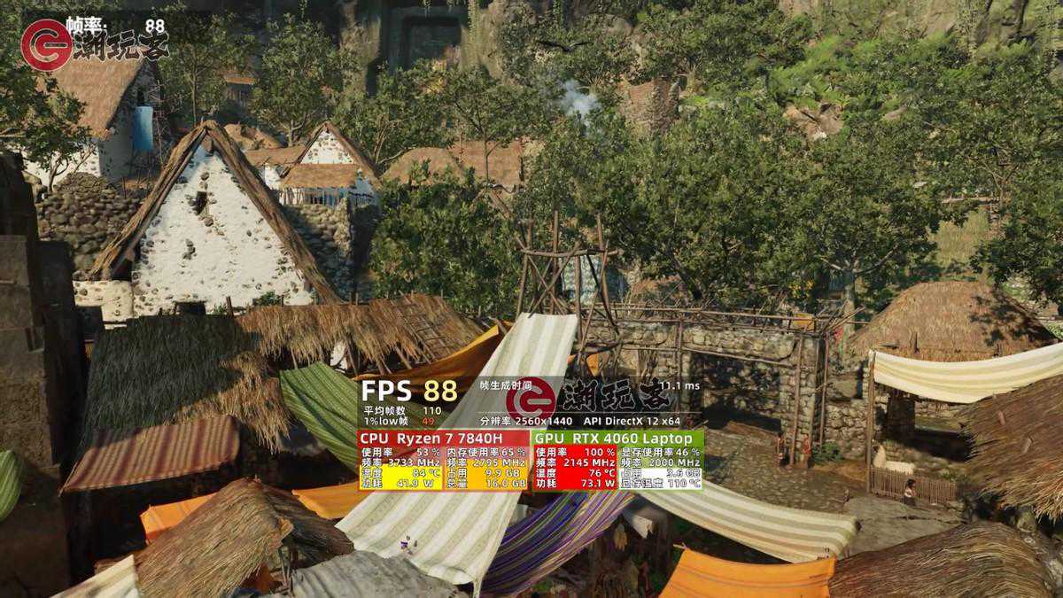 接下来是大部分游戏本用户关心的,游戏部分的测试,一直以来台式机用户最爱抨击笔记本用户的一大理由就是同样的显卡由于功耗限制,打游戏时候的平均帧不如台式机高,CPU还会过热降频,高频上不去,打游戏最低帧也不如台式,经常卡顿,风扇噪音还很高。但这么多年过去了,从当年8核R71700被华硕塞进笔记本电脑的ROGS7ZC,到现在,R9000P能直接硬上16核的R97945HX,110W的功耗差不多实现了桌面端旗舰7950X80%多的性能,我们不得不承认,笔记本的CPU能效比进步很大。尽管笔记本的CPU功耗虽然还是不如台式机那样,但是也能在一个合理的范围内释放大部分的CPU性能,这就已经相当不错了,而且严格来说确实现在的游戏本总性能释放也比原先也有了不小的提升,以前一个笔记本45WCPU+90W显卡的性能释放就已经可以算是中高端水平了,现在一个9000多价位的R9000P,200W性能释放还真不是吹的。以至于,RTX4060的功耗墙在笔记本达到了140W,比台式机115W还要高,说起来也是挺吊诡的。