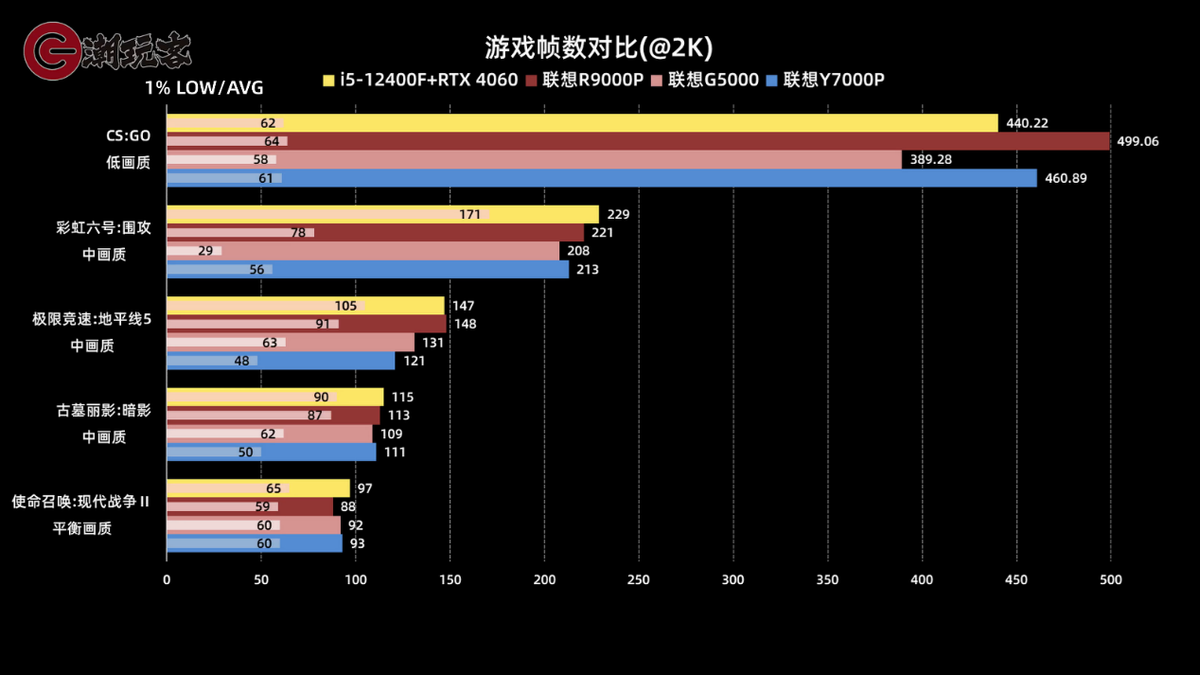 然后是彩虹六号:围攻,这个游戏对CPU性能要求很高,CPU性能越好平均帧数越高,同时游戏也会吃满显卡,所以如果出现了CPU抢GPU功耗的现象那就会明显掉帧,这对游戏本就很不友好,所以1080p下,平均帧方面仅有R9000P才能超过台式机,而12400F的台式则是在最低帧上横扫所有参测笔记本电脑,突出的就是一个帧生成稳定,没人和它抢功耗。到了2K分辨率下相对不太吃CPU了,显卡瓶颈了,所以台式机4060的频率优势在这里被放大,平均帧和最低帧继续领先三台笔记本。