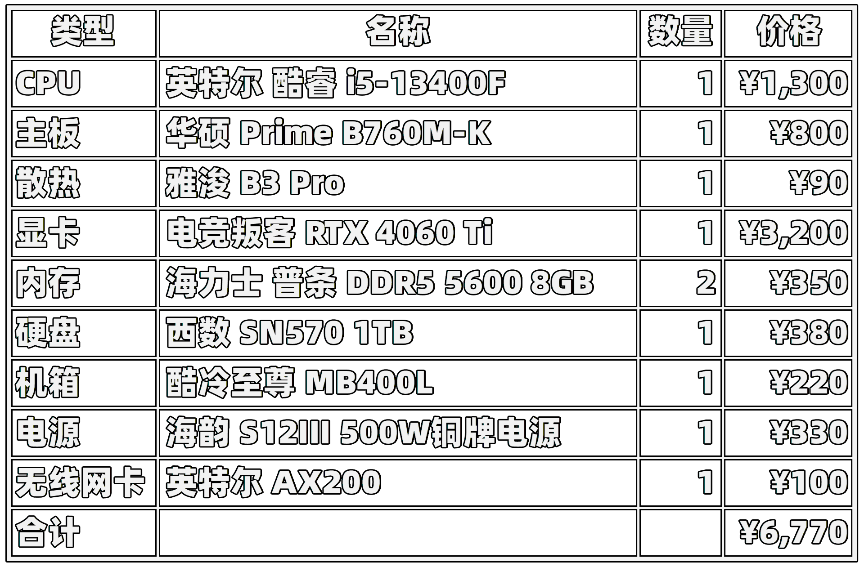 然后是4060的台式电脑,我这边大概列了一下配置单,包括了一台2K165或者1080p240的显示器,可以配到i5-12400F+H610+16GBDDR43200和1TB固态硬盘的配置。