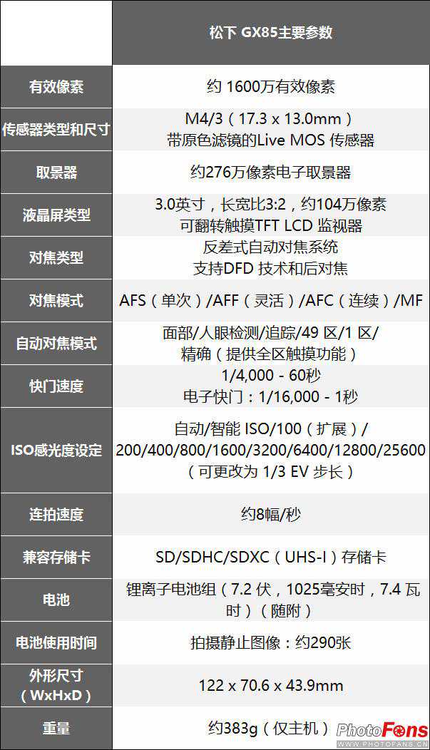 松下LumixGX85主要参数: